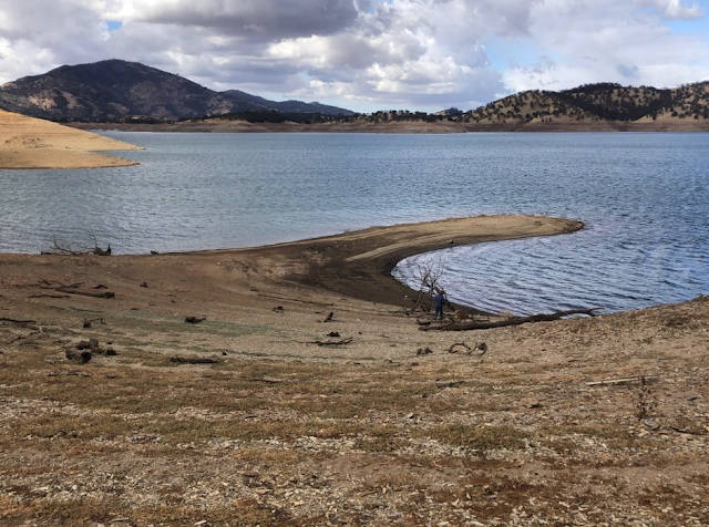 Our first hike (Saturday), we headed back to a place we hiked once before. We were shocked to see the water this low. We don't know if they emptied the lake in preparation for this winter's rains or if this is a result of not enough rain this past winter.